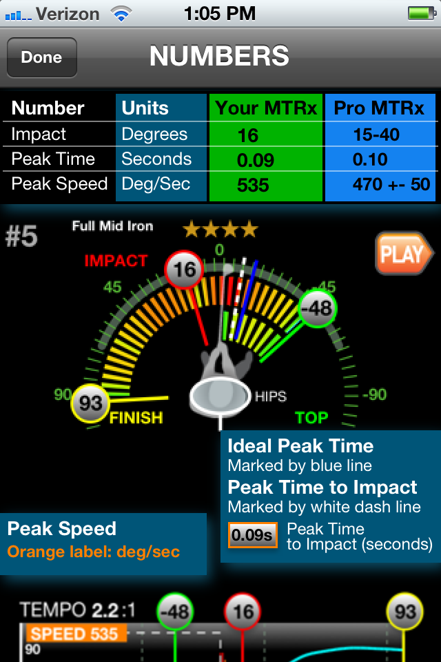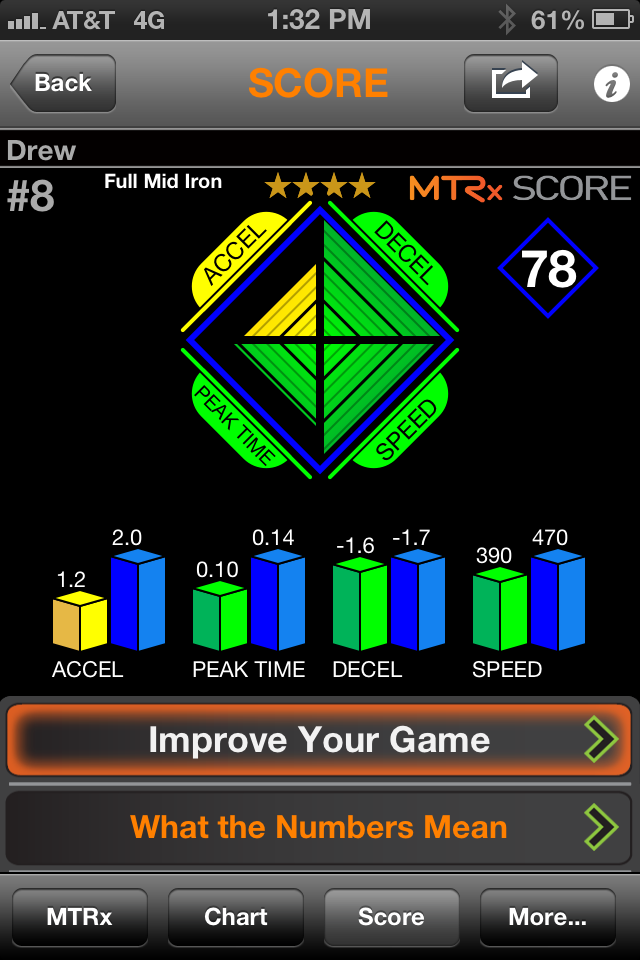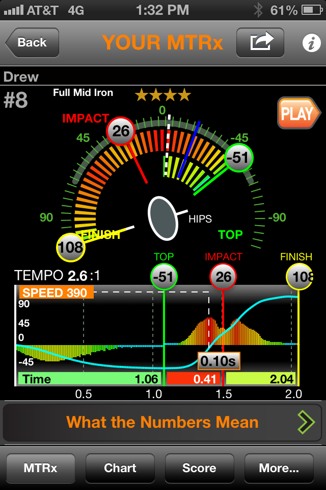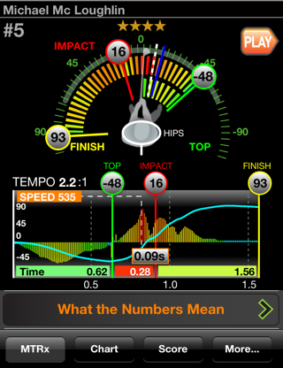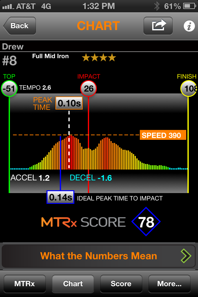 I just got the MTRx app as well and have tinkered with it a couple of times.  I'm still in the info gathering stage here, as I can see what it's showing me, I'm just not sure what to do next.  Here are numbers from my best swing today (result wise at least).  A high drawing 6 iron to about 180: