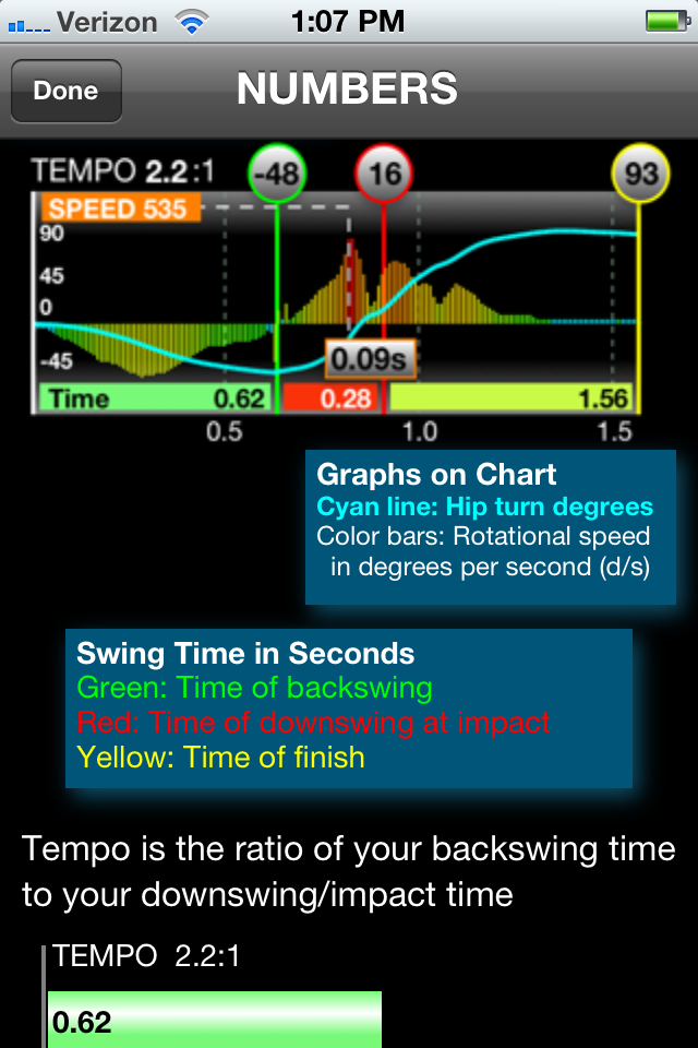 Over the last year and more I've worked steadily on creating more range of motion, mainly focusing on stretching my calves, lower back, hips and shoulders.  Before I started this, I was a bit tight to say the least, but now I have a better squat angle in my ankles, more range of motion on my take-away and more limberness in my hips than I've ever had.  What this app proved and continues to prove to me and my swing is that I sometimes 'spin out' with this new and improved range of motion.  Further, after analyzing my swing on each club, the app illustrates several drills to work on correction.