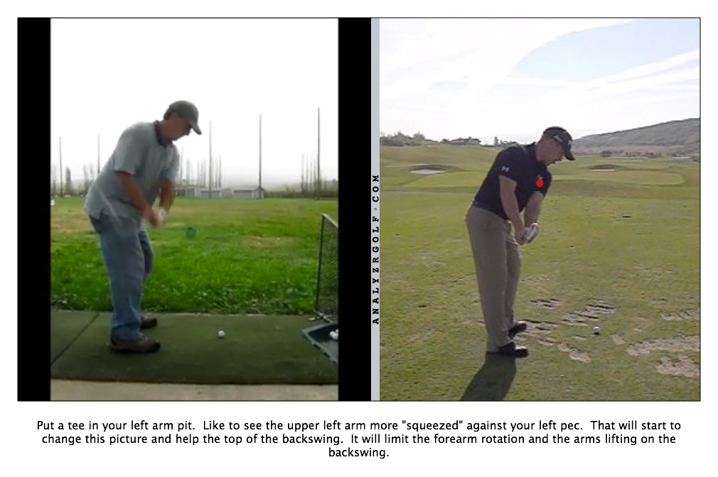 There's one more piece for you for the back swing, keeping the elbows closer together and not letting them pull apart.  This is a great drill to exaggerate the feel.  But for the next while, just focus on the upper left arm/tee in the arm pit.