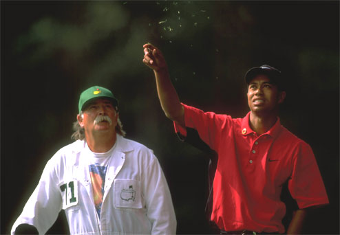 I think he was sick that week and Tiger, in an emergency, got David Crosby to caddie in his place.