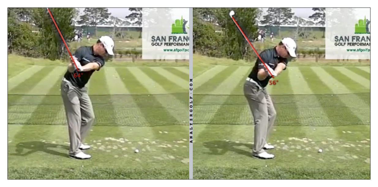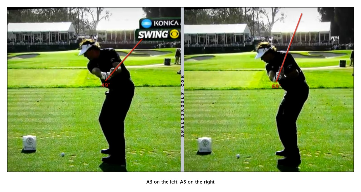 In terms of his swing, he does a lot of great things but this stands out and the reason he struggles off the tee.  Also why he absolutely hammers his irons.  Interesting pic, tend to see the pros go "steep to shallow" with the shaft.