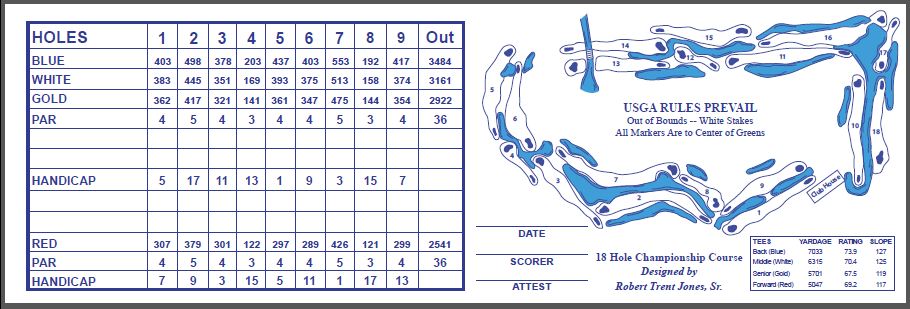 69/123 and the length from the blues is 6,043, short course. However, most other courses really complain when a golfer from the course enters one of their tournaments that's handicapped because our course really is not sloped/rated correctly in most people's opinion. I will easily go to other "more difficult" courses and shoot below my actual handicap. Our course is tight on almost every hole compared to most courses so when golfing elsewhere. This has been the trend for a lot of the members at my course. One of my favorite aspects of the course is you have so many options that all have risk/reward. It's tight but also short so you don't need to go with driver but the reward of using driver means a really short shot on many holes into the green. You also have great views on almost every hole, wouldn't trade the course for any other home course!