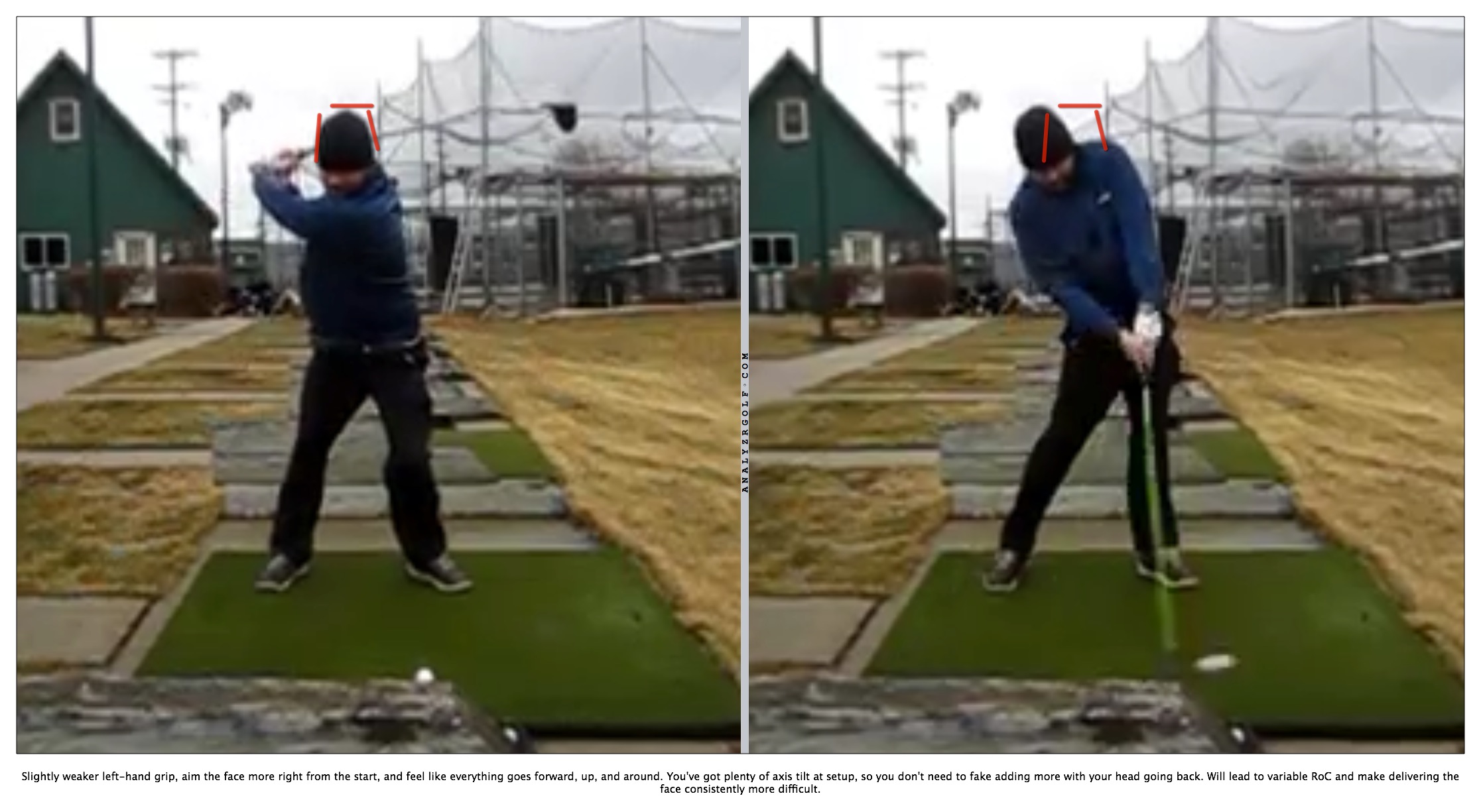 Coupled, with your head moving away from the target in the backswing, could cause your pull hook if you get a neutral to outside-in swing path and the face shutting down.