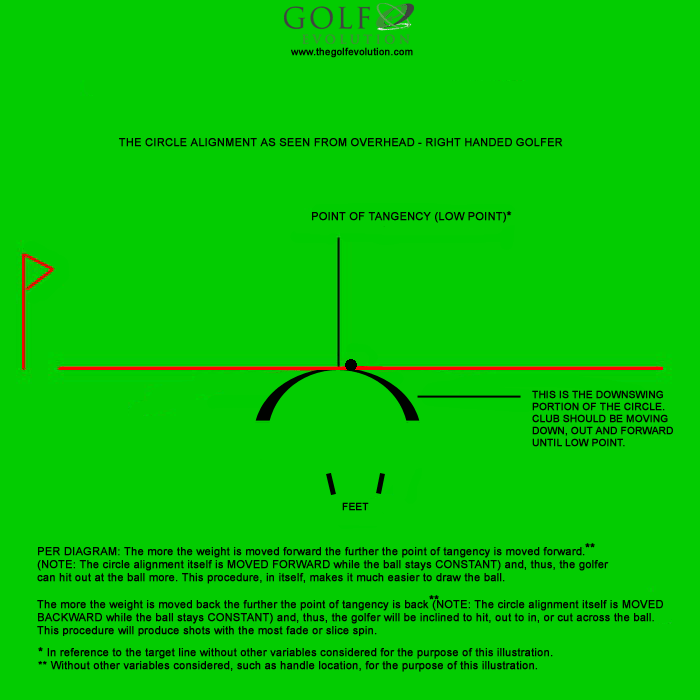 In reference to the diagram posted, if you move ball position back along with weight, the line of tangency would therefore remain just ahead of the ball, wouldn't it?  Why not just move the ball to a spot that allows a descending blow, from in-to-out, with the club bottoming out just after impact.  It isn't that big of an adjustment since the weight shift to the back leg is not that great to begin with.  And it eliminates the need to shift weight forward (at least consciously).