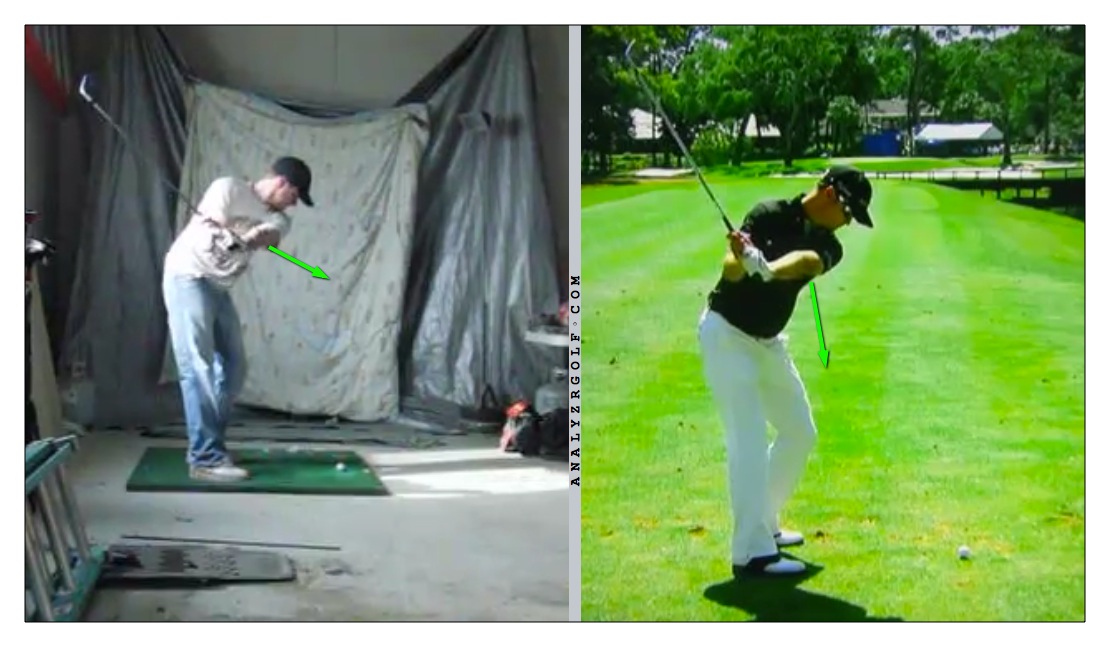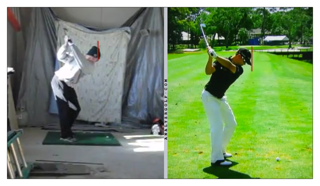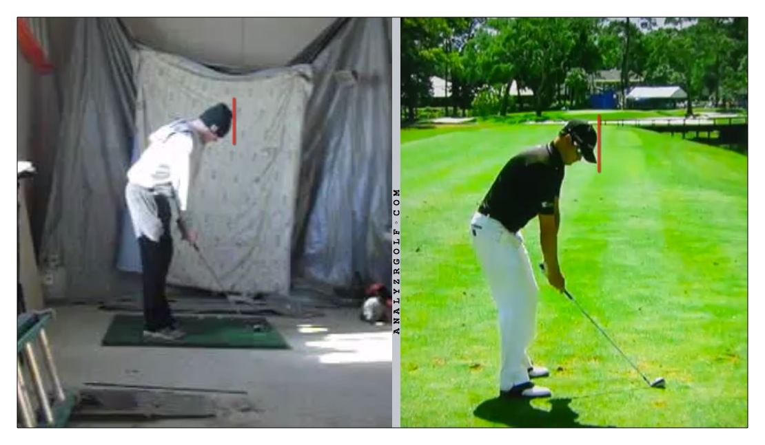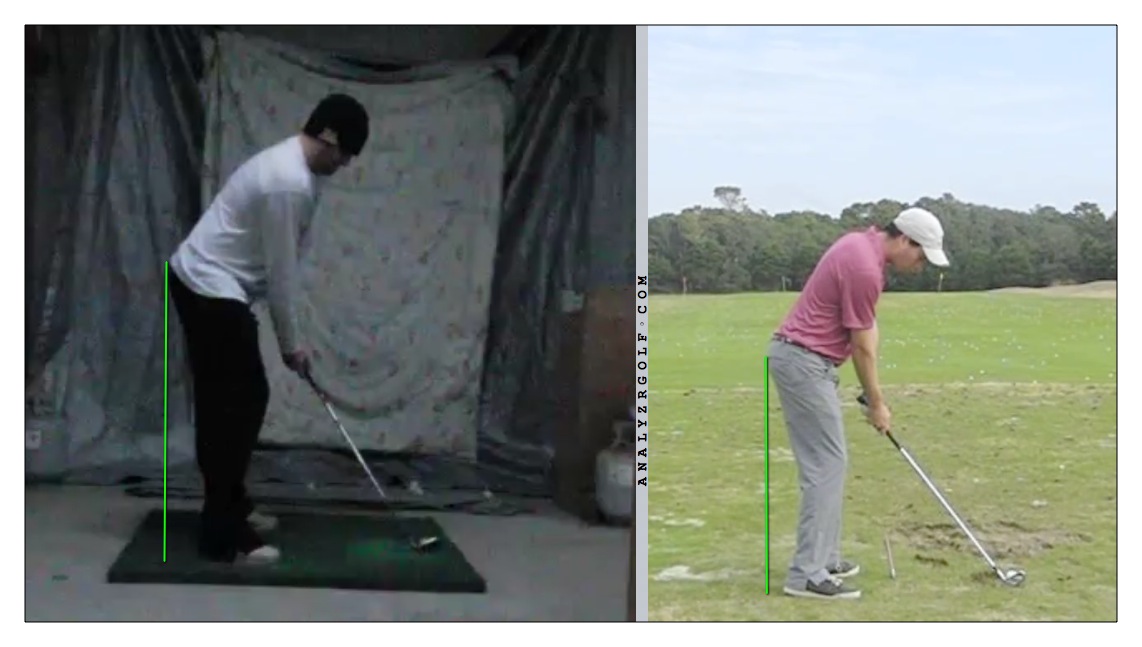 Below, note the weight is more in the center of the foot, helping the club load "steeper".  So I would suggest feeling the weight more on your toes in order to find a happy medium for now.  Also stick the butt out less, tailbone will feel a little "tucked" at address.