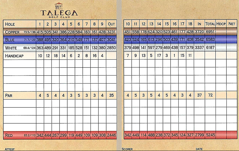 For Talega, I would recommend we play the blue tees ... which are at 6600 or so, and all people over handicap "x" (20, maybe??) play from the whites.  (And, of course, all females from the reds :))