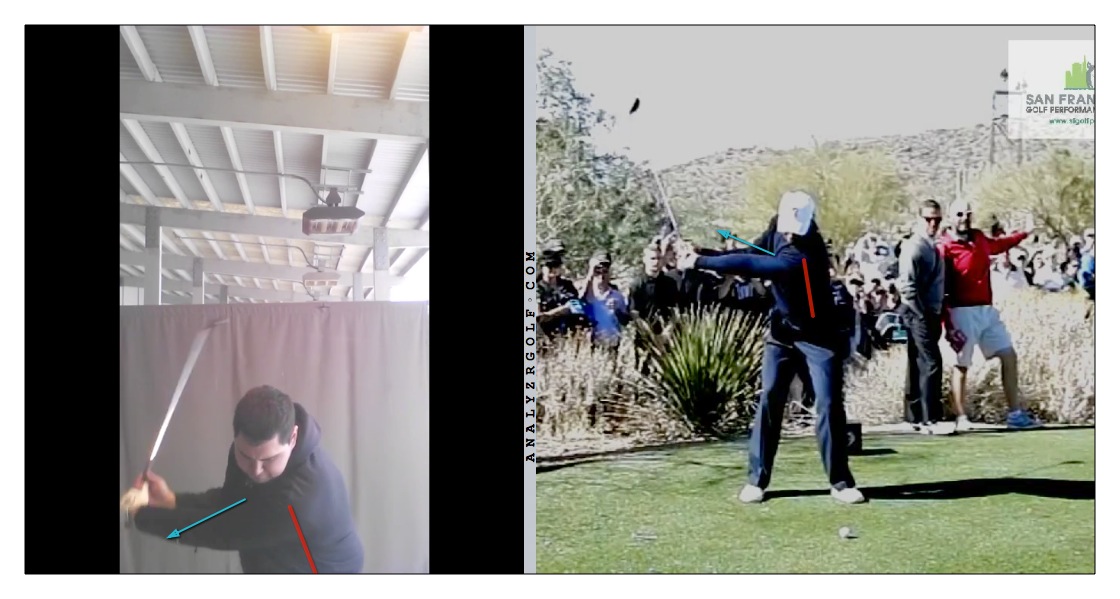 Tiger is stretching more, notice his right hip is high and his chest is facing the sky.