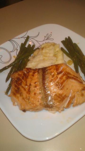 Salmon in a lemon rosemary sauce over gruyere mashed potatoes