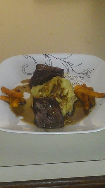 Short ribs in a red wine reduction with roasted carrots and mashed potatoes