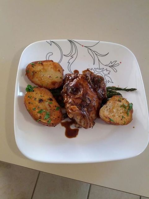 Chicken thighs in a balsamic sauce over asparagus with roasted potatoes