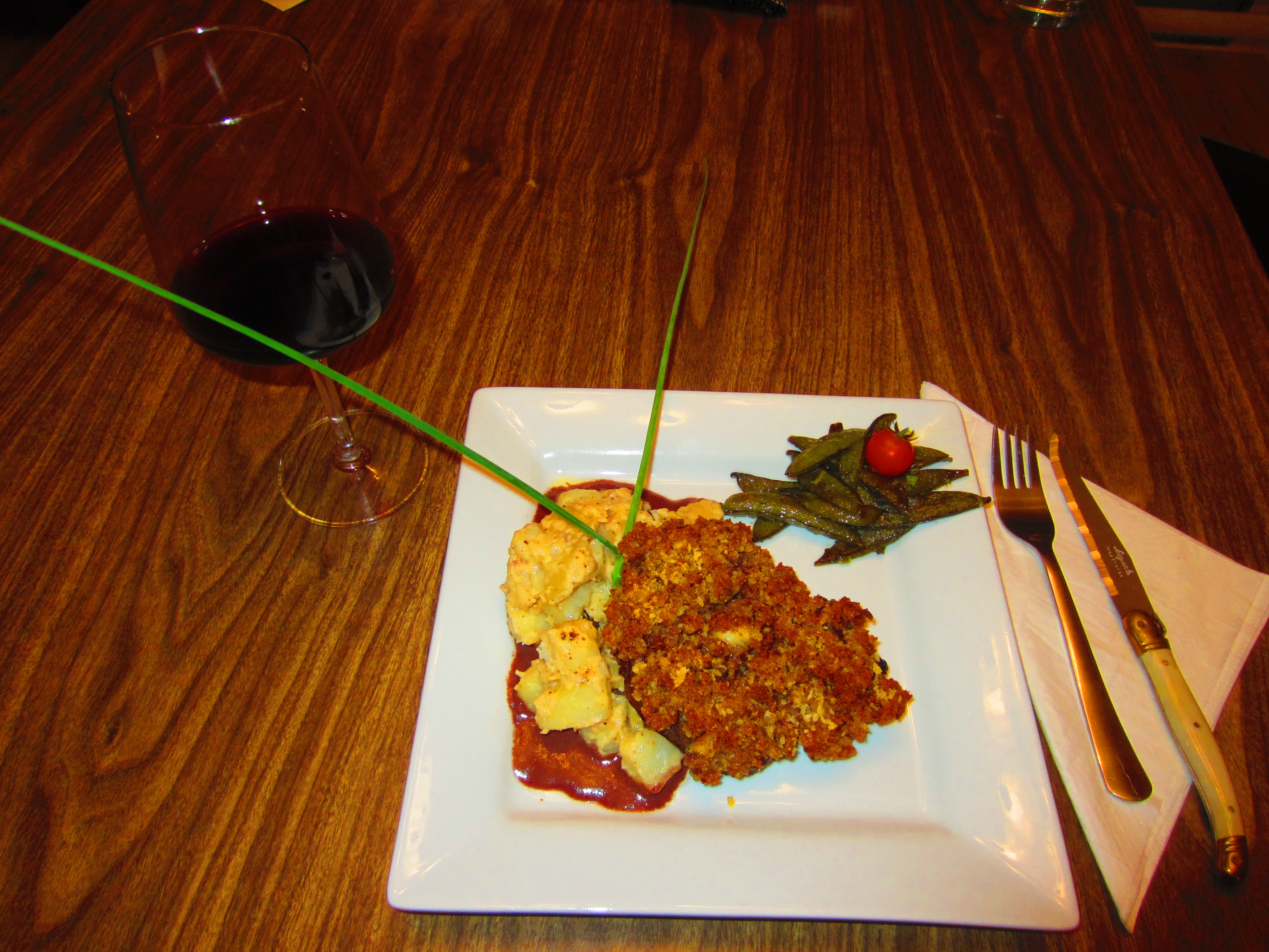 Filet Mignon with a blue cheese crust on horseradish cream potatoes and a cabernet sauvignon sauce.