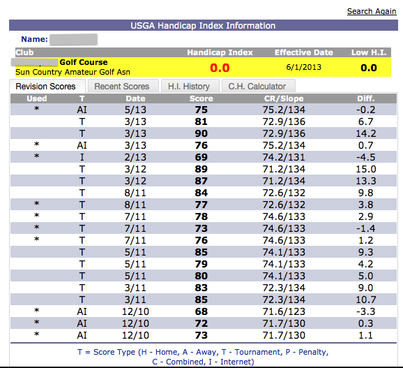 I blurred the name, to protect the innocent. Check out the tournament scores compared to the casual rounds. He goes to a bunch of our state amateur competitions and embarrasses himself. I actually played with this guy one time. I recognized his name because I was the handicap chairman at the time. I asked him why he never played in any of our club tournaments. He told me that our club tournaments didn't have enough competition for him. I then proceeded to beat him by like 15 strokes. At the end of the round I told him we had plenty of competition for him, except he would need to get his handicap up. He is at best a 8-9 handicap.