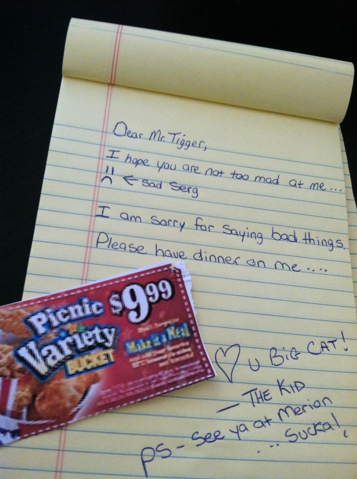 I already said… it wasn't a note, it was coupons for KFC. Stupid Sergio. All you have to do is go online .