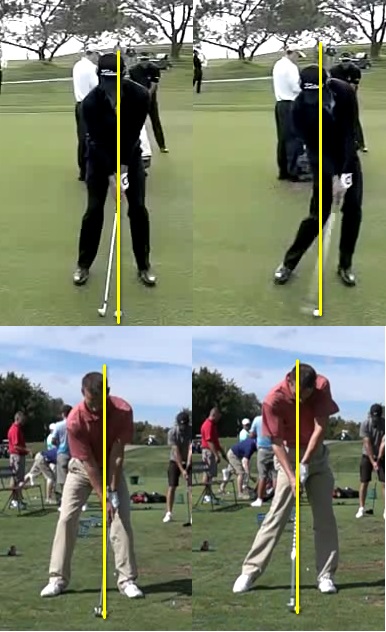 I see two main things in the comparisons here. At set up we both have the ball at pretty close to the same spot and at impact I've moved my head way forward and his is pretty much exactly where it started..I think if I were to have the inline at impact position I'd be blading or topping the ball in the position I'm in here. Which is exactly what I was doing when hitting balls on the range that day.