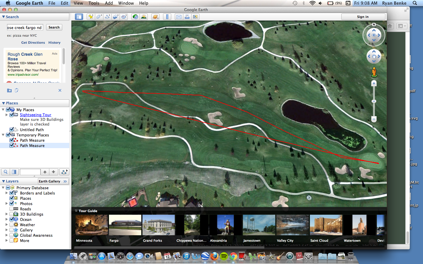Alright, here is the layout of the hole.  The top path is how I would think that the hole is measured for distance purposes.  The top path is about 465 yards.  The bottom path is what I believe to be the shot path that I took.  That path is about 455 yards.  The spot where my shot path intersects the cart path the last time is roughly 300 yards.  My 2nd was played just beyond that cart path.  This distances aren't official but they are the best that I can provide.