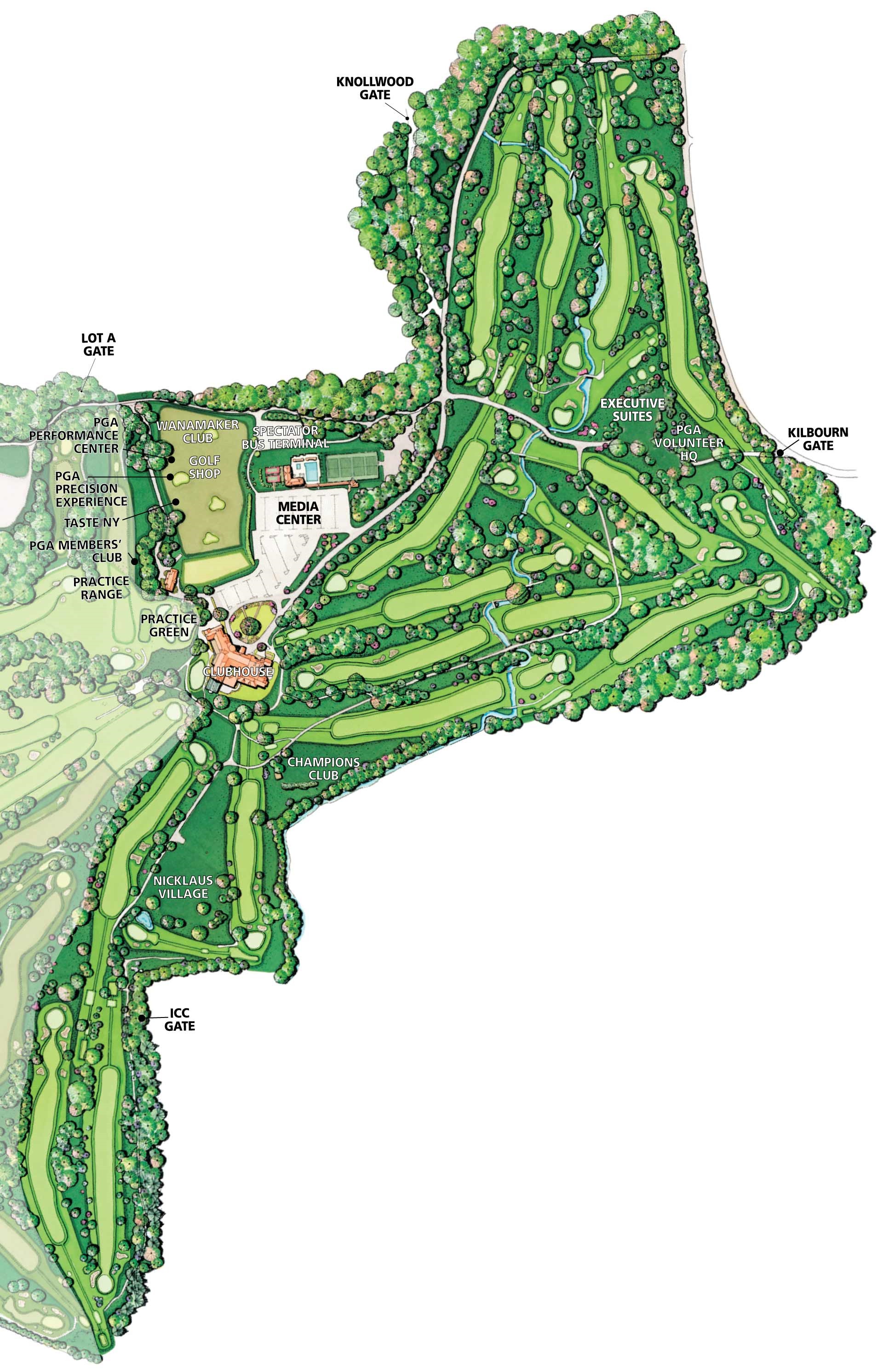 This might help. The link has information like hole numbers, yardage, leader boards, concession stands, rest rooms, etc.