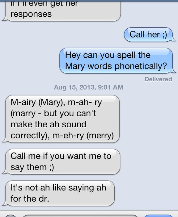 The "ah" sound she's referring to for marry is confusing.  She says the "a" exactly the same way you'd say it in the word "at."  Anyway, like I said ... if you heard one of "those people" ;) say those words, you'd understand. :)