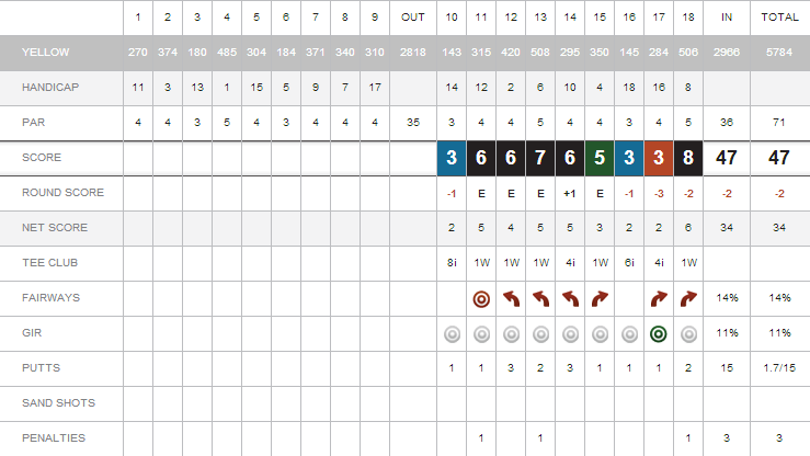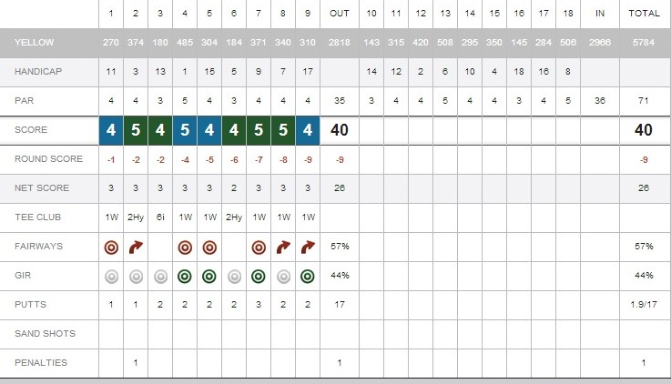 Just got back from a quick 9 holes, making the most of the lovely sunny weather here in the UK. Probably played the best golf of my life. Hitting most of the fairways and my ballstriking was pretty hot. Shot pattern for the day was a nice controllable fade however on the 8th hit a huge 100yrd slice off the tee, was lucky to have a good lie and shot into the green saving a bogey. I didn't manage to get a video from today but my swing thought was getting my left shoulder towards my right foot on my backswing, was getting a bit flat the other day. Here's the scorecard from today: