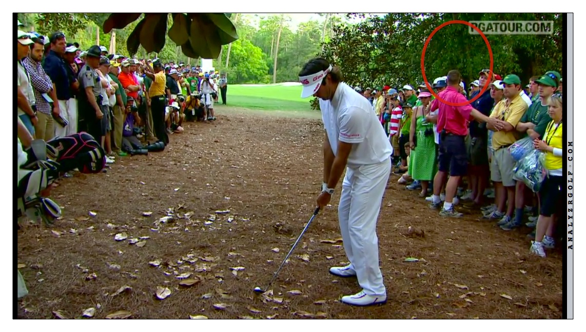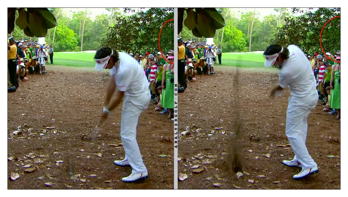 Ok so maybe he really closed the face at impact and the face is pointing towards the green.  Well if the face was aimed towards the green, then the ball would start towards the crowd and into the trees.  Really tough to tell in these pics but we know the ball came out of the gap and hooked on the green.  We know the ball starts primarily where the FACE is pointing at impact and curves away from the ball.  So Bubba's clubface had to have been aimed well LEFT of the green, not aimed at the green.