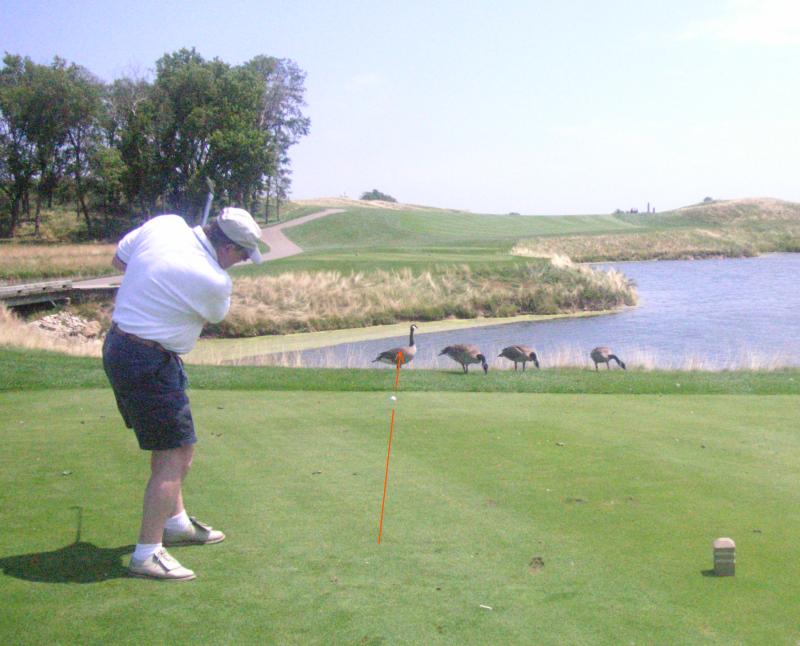 My friend did hit this goose and knocked it into the lake. He said it survived. Meanwhile I was taking a pic. I didn't realize that I had almost caught the moment until I got home and downloaded the card. Missed a heck of a picture by a few hundredths of a second! Did catch the ball though.