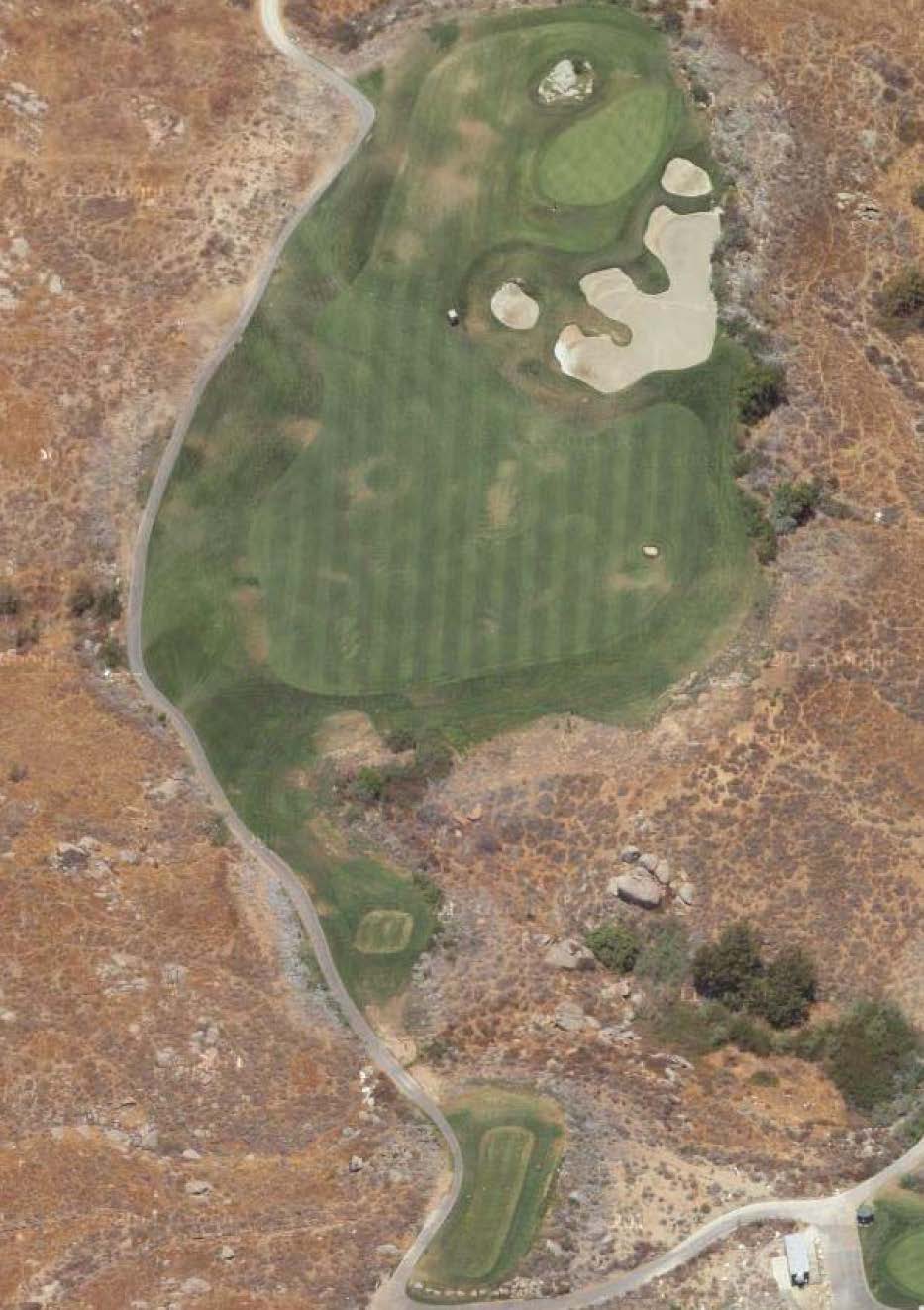 Been a while since I played anywhere but CO so can only say what I would do up here. That's a layup 7i to the fat of the fairway and a knock down 52 here. As small as the green looks I don't think I'd go for it. Missing to the left isn't any easier than taking it over the bunkers. Looks like there's a risk of hitting it over the green to the right coming in from up there due the narrow shape.