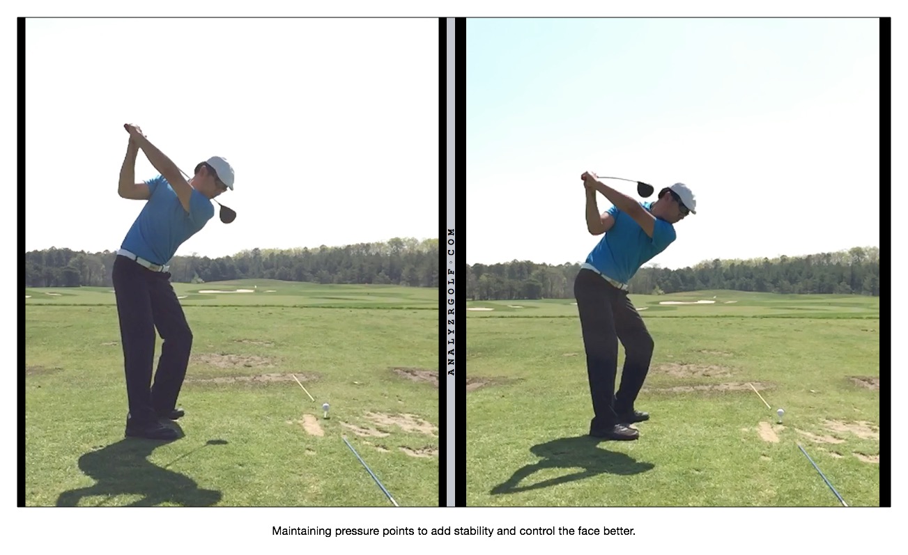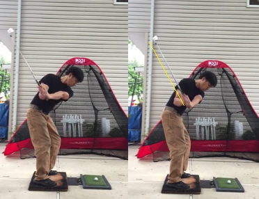 Image on the left is the takeaway, image on the right is the downswing. The yellow line on the right image shows the original position of the shaft.