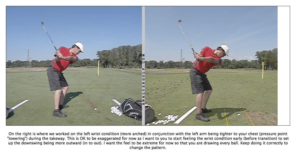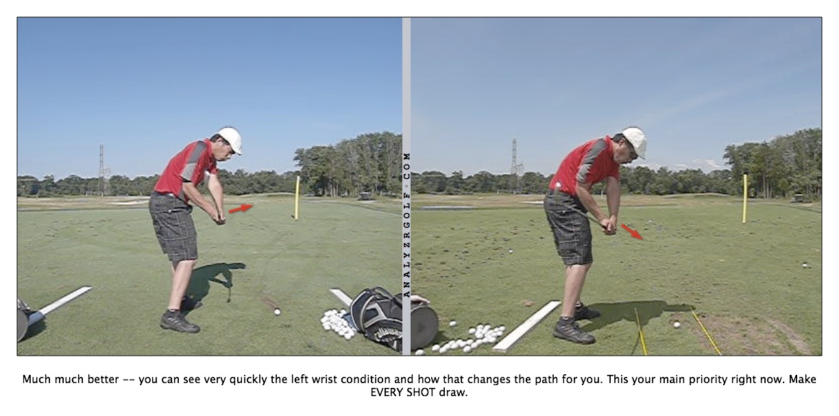 Yeah I figured that. Can be a chicken/egg type of thing, some players will shallow it by getting the weight further forward, some respond to it better by shallowing the shaft/flattening the lead wrist. If you shallow it out ( with decent body alignments) you "have to" transfer forward, makes it more instinctual IMO. Golfers that steepen it have to back out of it in an attempt not swing down and left a million degrees.