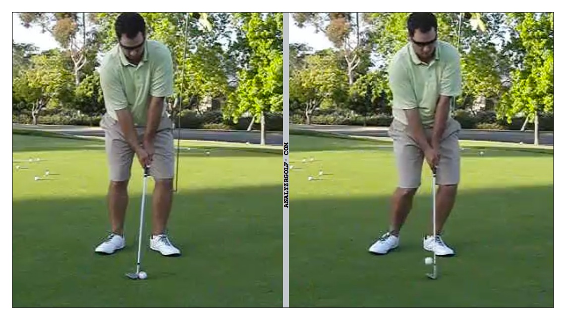 Here I am hitting a pitch off a green, notice the ball position and lack of handle lean at address and impact
