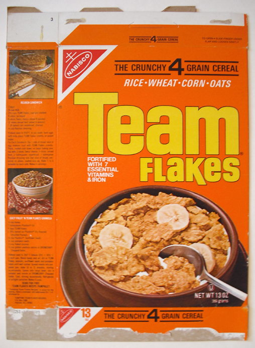 thought I was all alone in my dreams of having a "Jethro" size bowl of TEAM flakes. I haven't been able to scracth that itch in 20 years. My wife and I were sking in Tahoe right after we got married when we went grocery shopping. I found TEAM flakes on the shelf and my new wife started to wonder why this man she had just married was getting so worked up over a "box of cereal".TEAM was never just a "box of cereal" .