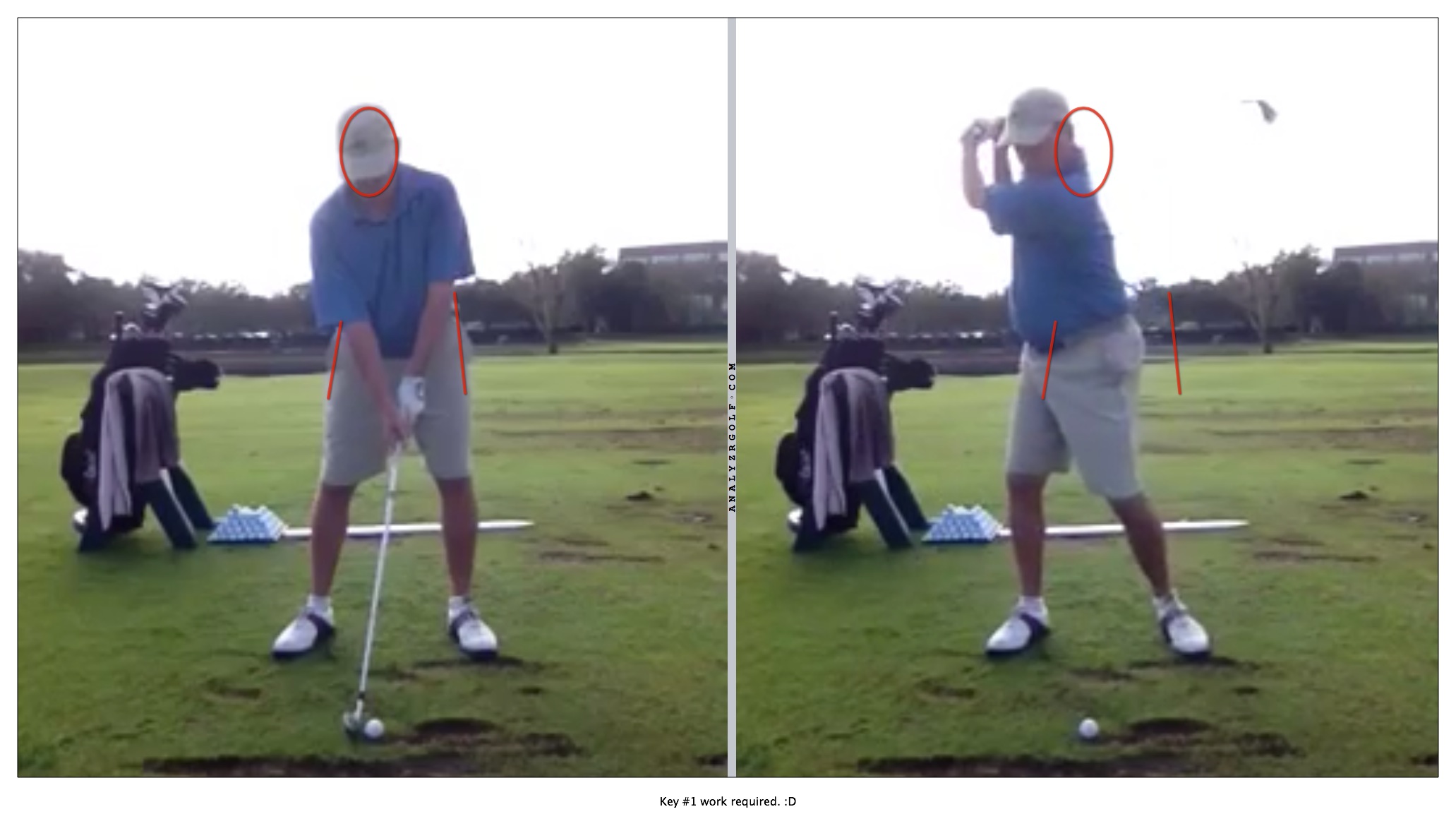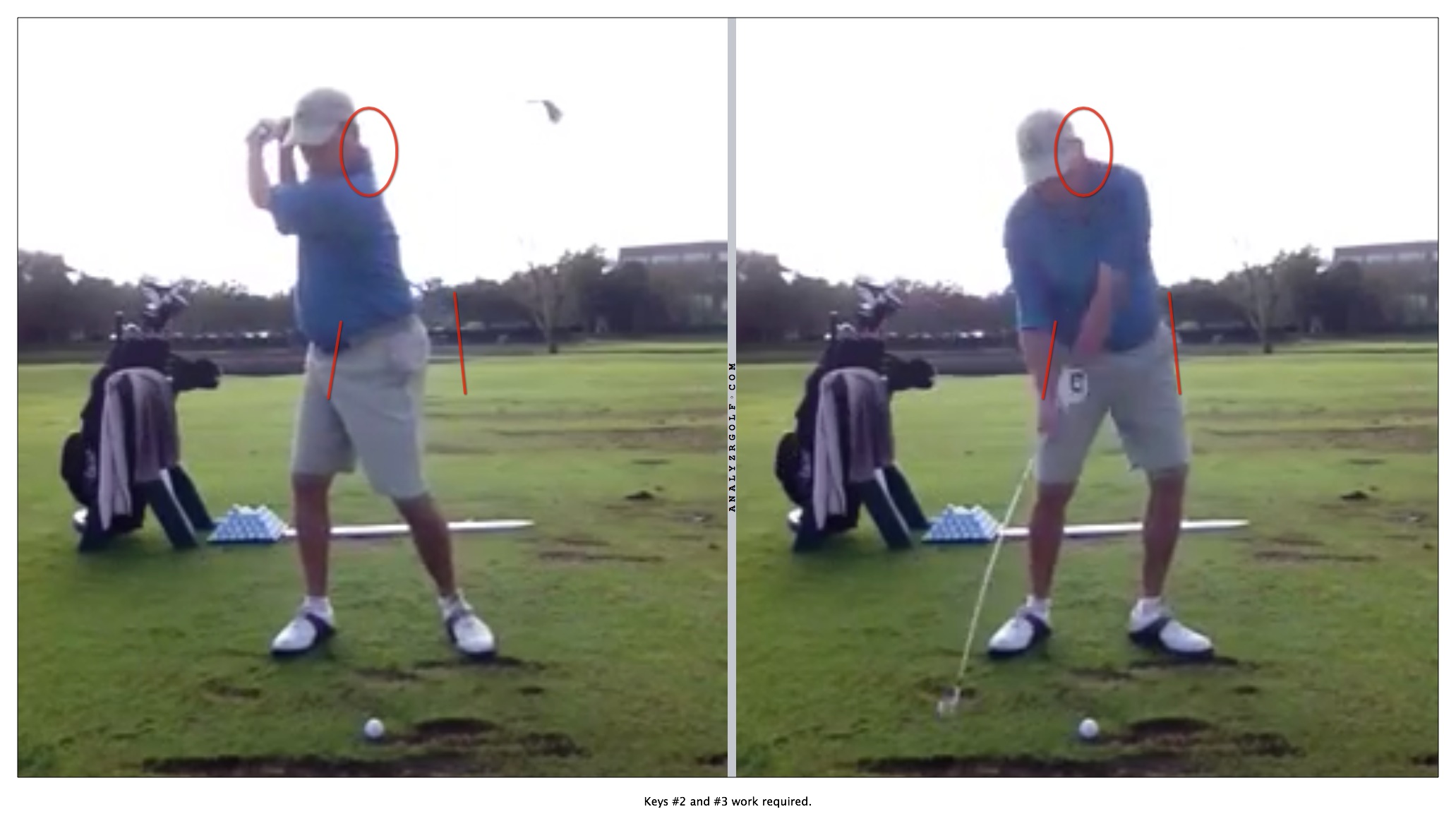 2) Left shoulder should drop more towards the ball in the backswing. You get very flat shoulder turn. Left hip goes up and back, not around.