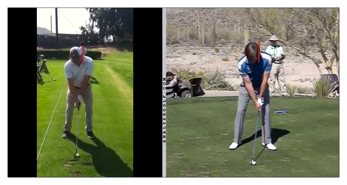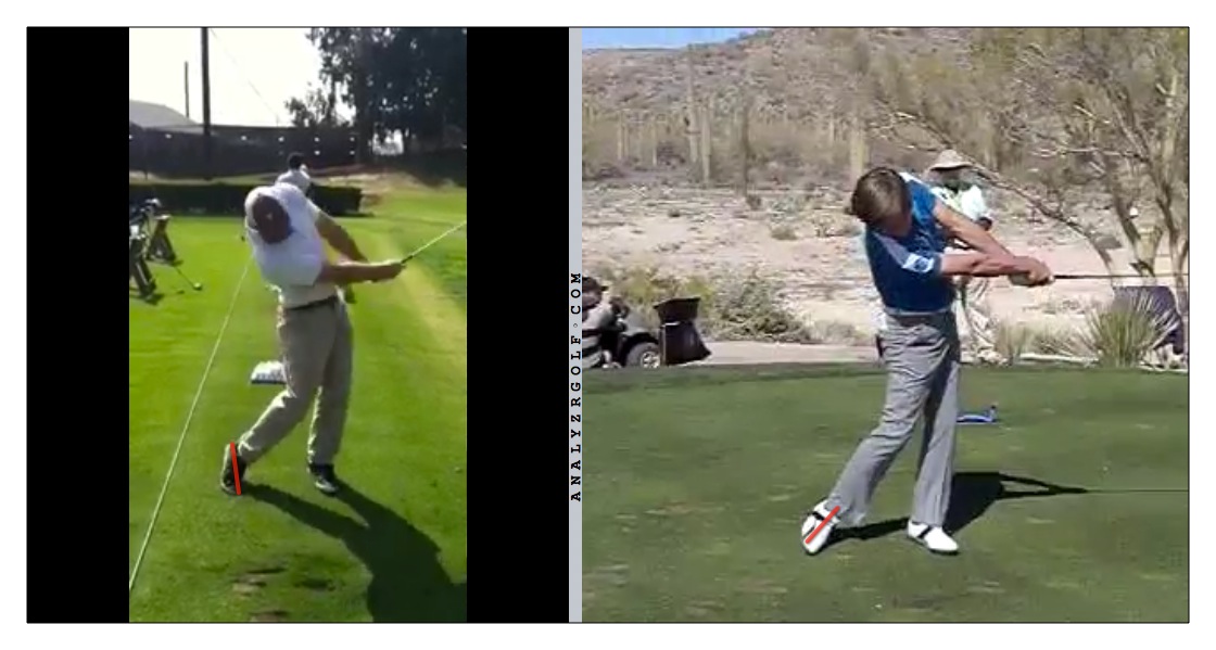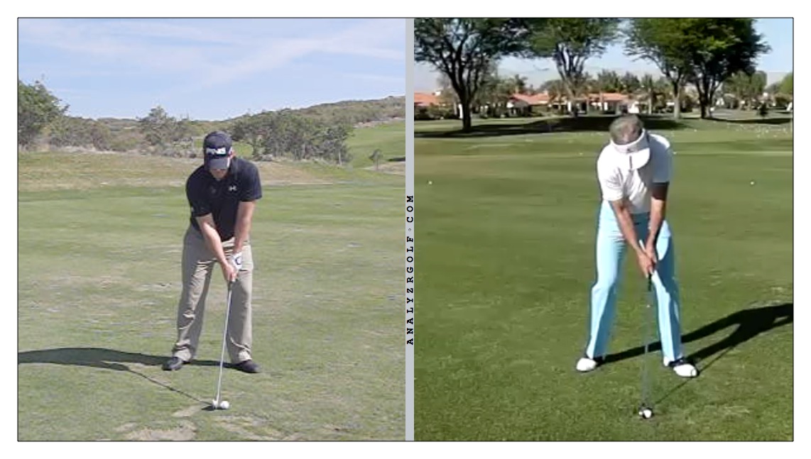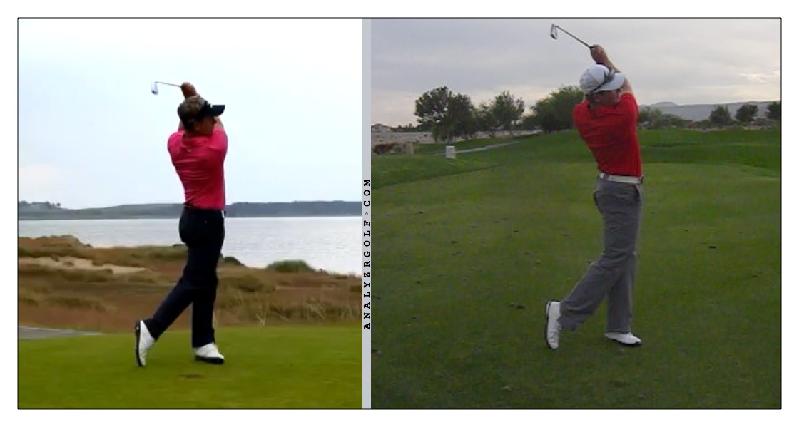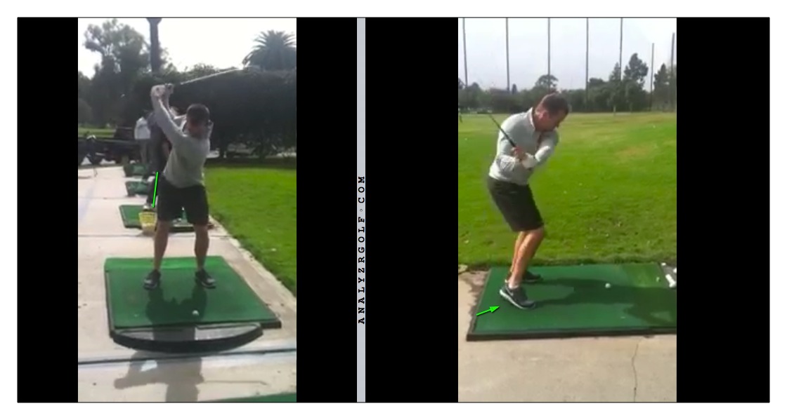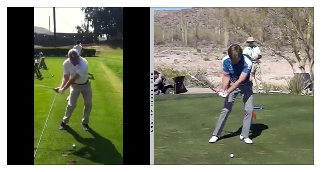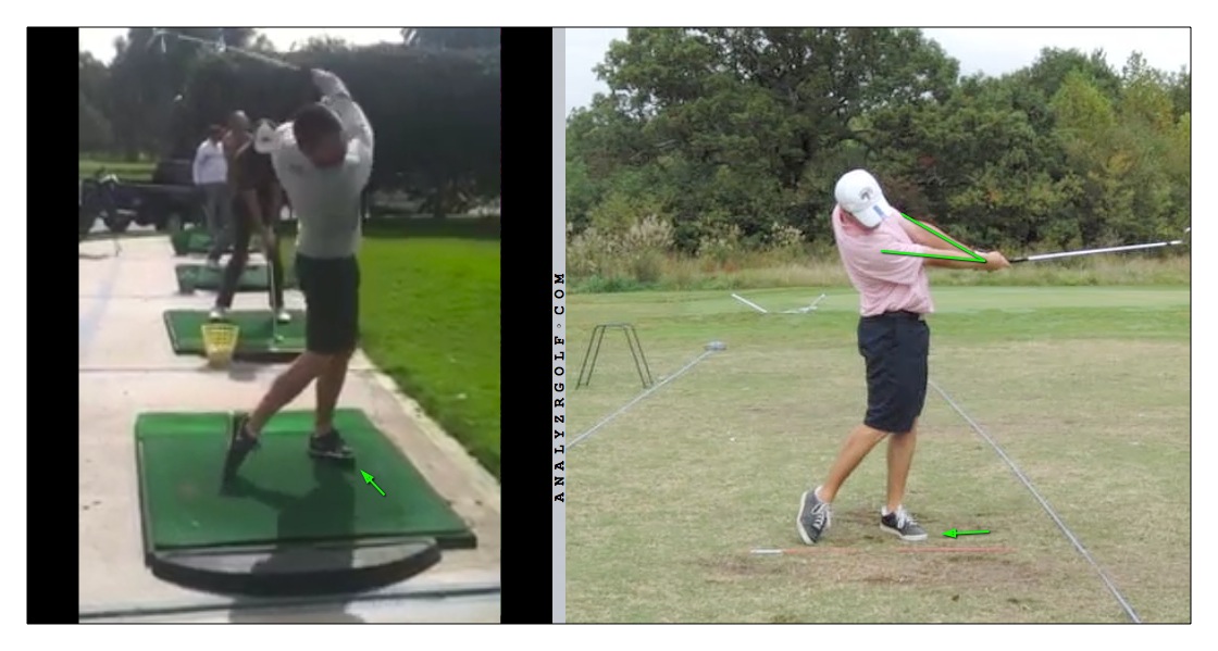 Really nice work with the set-up regarding the feet, knees and left arm, looking good. Now the hips don't move to the right on the backswing (left pic.