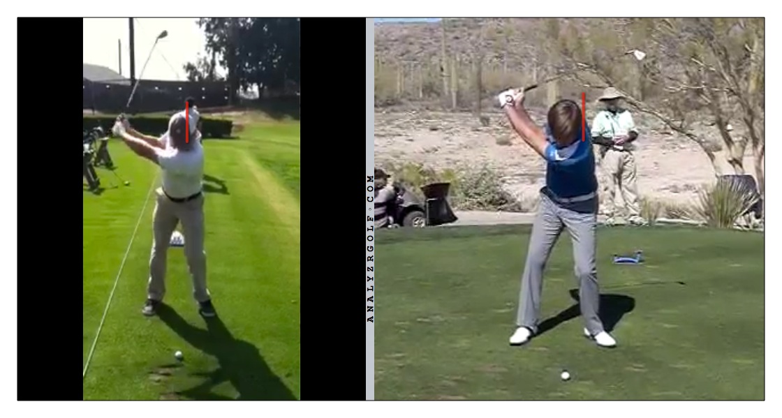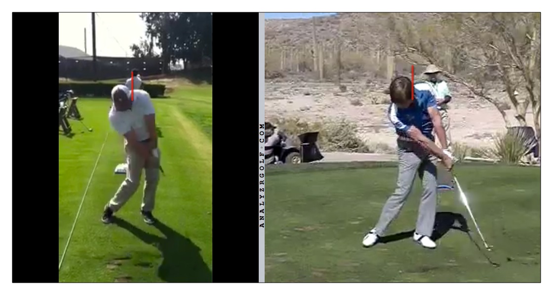 Starts with the backswing, hips slide back a bit, head goes towards the target. Then on the downswing head goes back.