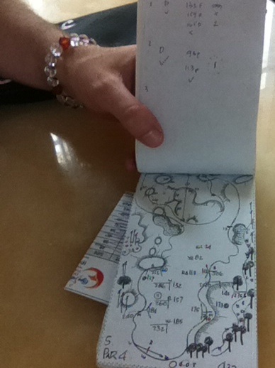 Round 1 and first things first. This bag was like nothing on my back. Maybe it was the excitement of our first round, the mystery of the unknown propelling both of us along today. It certainly wasn't the BLISTERING heat! I was practically running the course. Our comeback finish maybe had something to do with it too. So, paired with Michael Long and Young Kim. Long being a vet in the twilight of a solid steady career of global golf. And Kim being just 22 like Sam and also happened to finish runner-up in this event last year. Long finished at Even. Ran hot and cold all day. And when approachable was more then willing to share stories with Sam. Kim came out blazing. I think he shot -4 on the front finishing at -3 on the day. Sam... We'll as the old baseball cliche goes, it's not how you start it's how you finish. And as Stepehn Leaney put it in the practice round. This is just one round of a career that can quite possibly last another 30 years. Don't sweat a round or two. That being said he finished at +2, 74. +4 after the front and as Sam likes to do, finished strong with a -2 back. We talked at dinner, along with his Dad who is also here with us. We didn't call it nervousness, not really choke, nor over-enthusiastic. He's played plenty of events, has pulled in a few wins and more then often has a solid showing. We're gonna go with, first real tournament and the start of his adult life's work. Sam put it into other words, and I apologize to any female members reading along, he was swinging like a bitch. Once he figured that out, he didn't really catch any breaks for a while. One other key, sweat. I'm lucky, my pals don't sweat at all and I play without a glove. Even today my hands were as dry as could be. My head was another story. Sam's arms on the other hand were drenched. Once we wised up and started wiping down after each shot. Things def made a turn for the better. Here's the breakdown, in pictures. I'd imagine some of you may want to see what our yardage book looks like. So I'll attach the pages that were the shining highlights. "D" with a check mark means driver tee shots hit the fairway. The numbers next to that are the yardages "F" for Front, "P" for Pin and "B" for Back. and maybe a club selection the check in that section meaning he hit the green. UAD is Up And Down. And the last number are his putts. I'll start with the back 9 since that's where we started... Maybe I'll write a little bigger tomorrow; Hole 12, D - 104y 56* - 1 putt Hole 4 , D - 211F/228P 4i - UAD - 1putt That's that. 7:30 tee time tomorrow. We're up and to the course at 5:30... bleh. Time for bed.