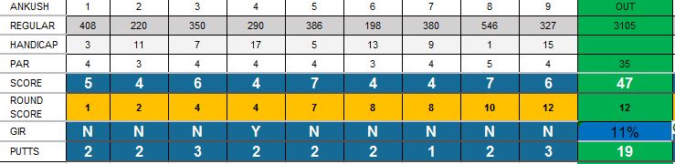 10 /9 GIR's was a great day for me usually i am abt 6 gir's a round and 50 putts, this day just ruined it for me completely. swing to come today hopefully if i get to the course. will have the caddy film my swing once i am on the green.