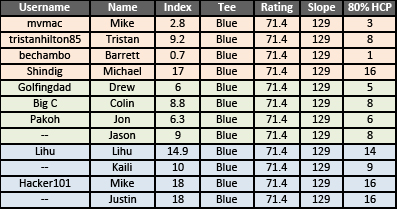 Remember that we are playing modified stableford and everybody gets 80% of their course handicap. The best 3 scores on each hole count.
