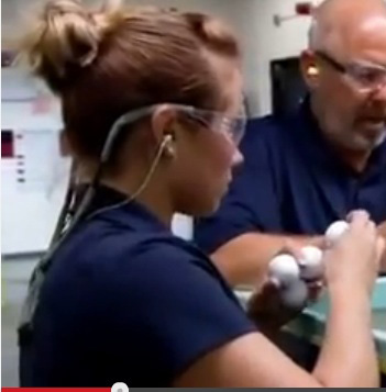 Balls are being spat out in the thousands. They inspect them randomly by eye - and then take out a random box and check them.