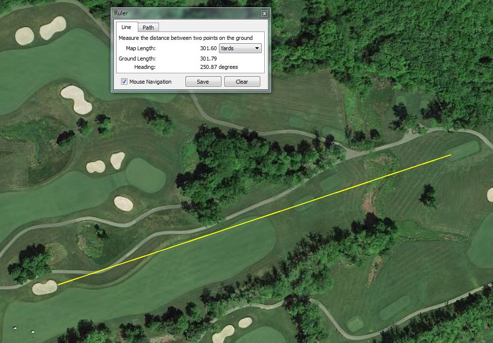 Yea I mentioned that, the image above shows the start of the bunker is 300 yards from the tee position that day. Take off about 10 yards because it is downhill. Unless it is VERY downhill, usually you can add 1 yard for each yard you are going down hill. Drivers usually impact around 45 degrees.