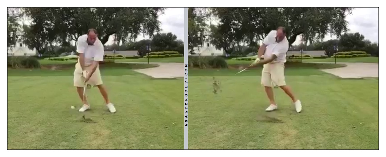 But the right arm isn't all that bad, it's pretty straight at impact. You'll notice that the shaft and lead arm aren't lined up (Key #3), so that early "throw" is causing things to line up too early and the bent right arm in the next pic is just a result if the club overtaking the hands at a fast rate.
