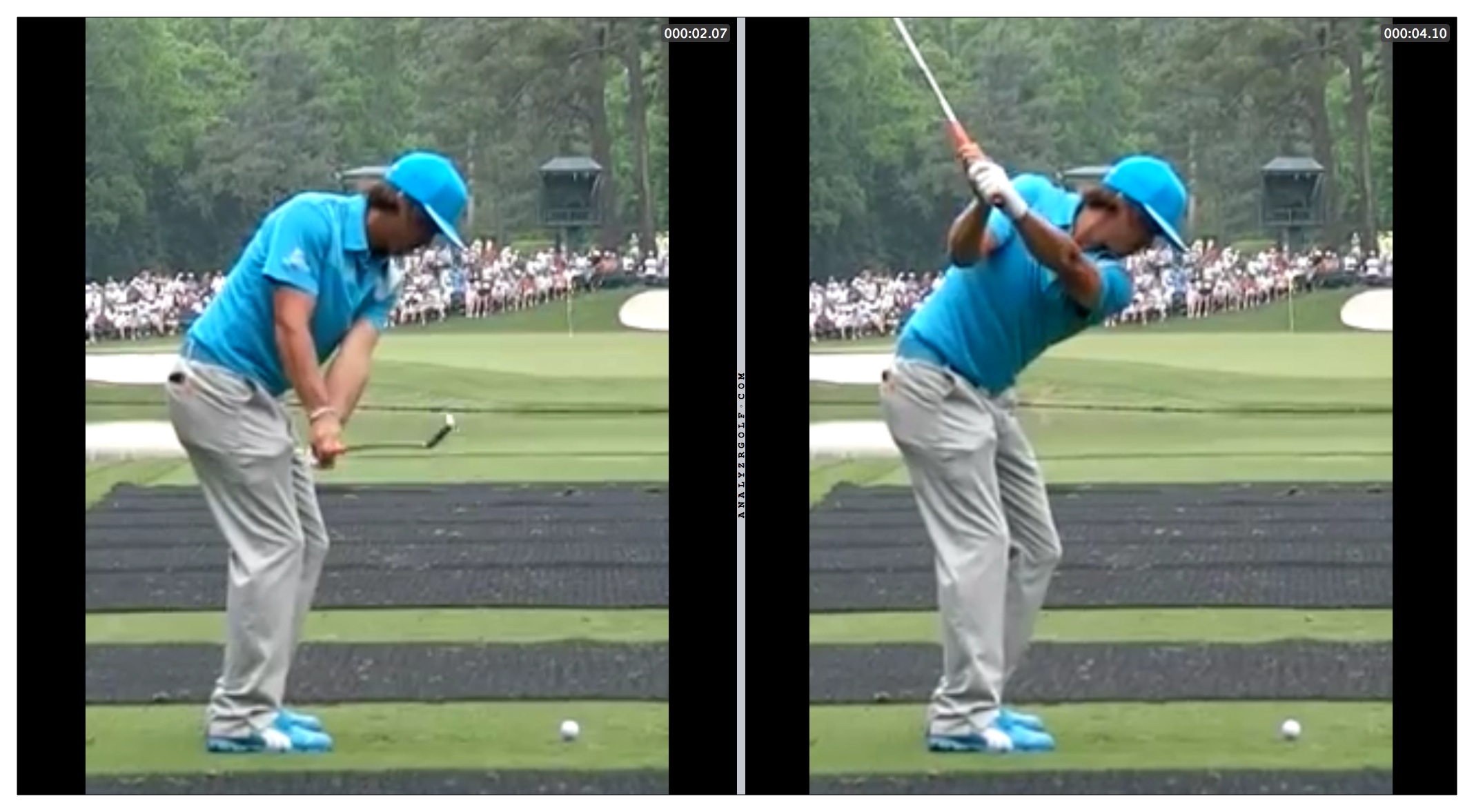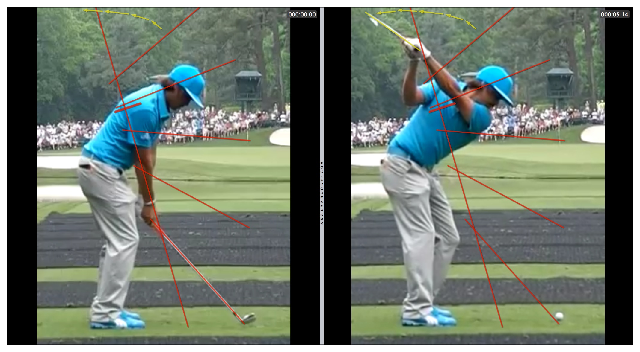 If Rickie continued the backswing without rotating, the shaft would trace the red lines. Instead, he rotates (the yellow arrows).
