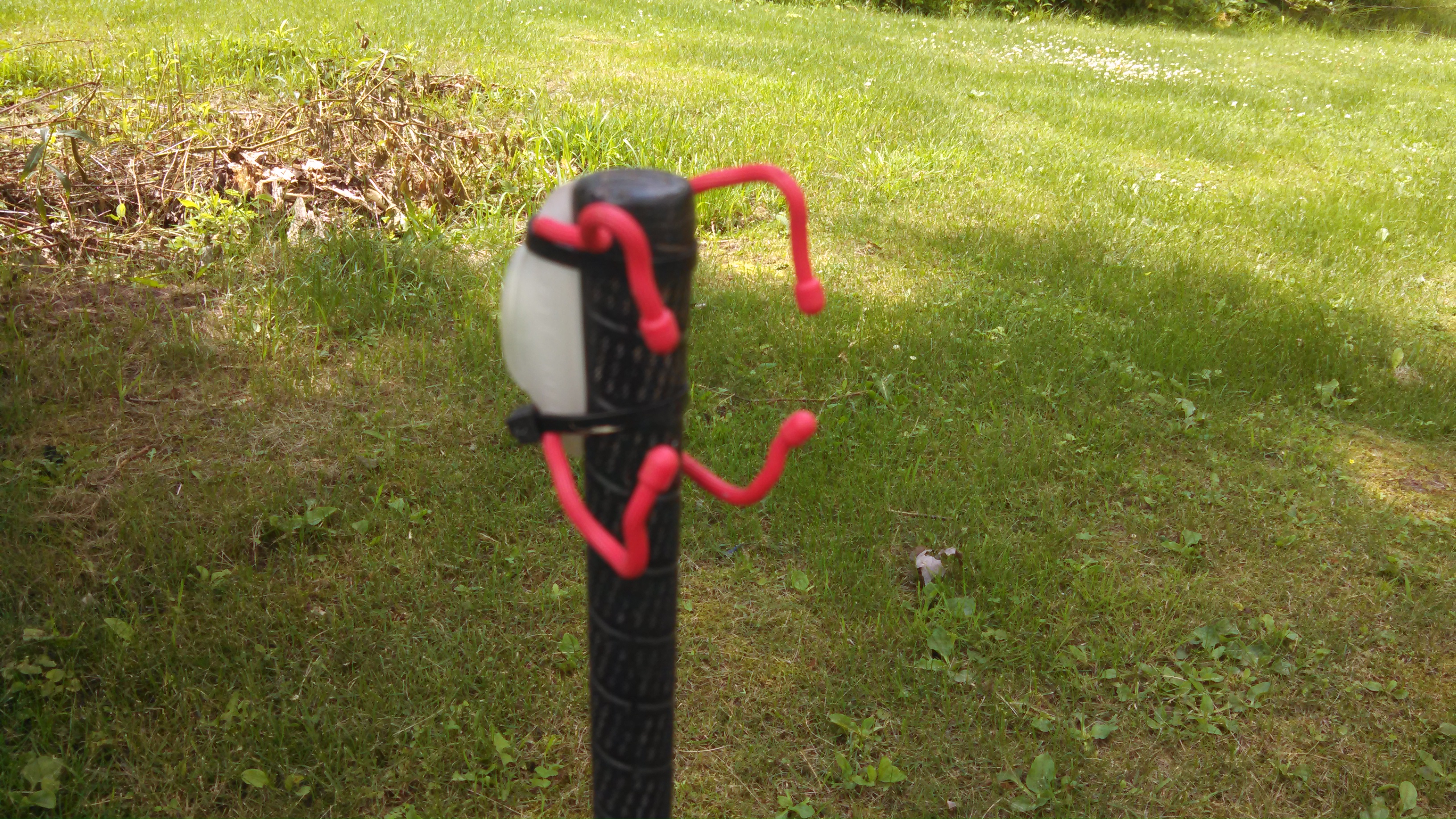 I had a bicycle light that I was not using anymore.  It had four rubber arms with wire inside them?  Either way, the arms were designed to be flexible, but stay where you put them.  I pulled the light part off, and zip-tied it to a golf shaft.  It fits right in my bag.  To setup, I just stick the shaft in the ground, and slip the phone into the rubber arms.  Pretty easy.