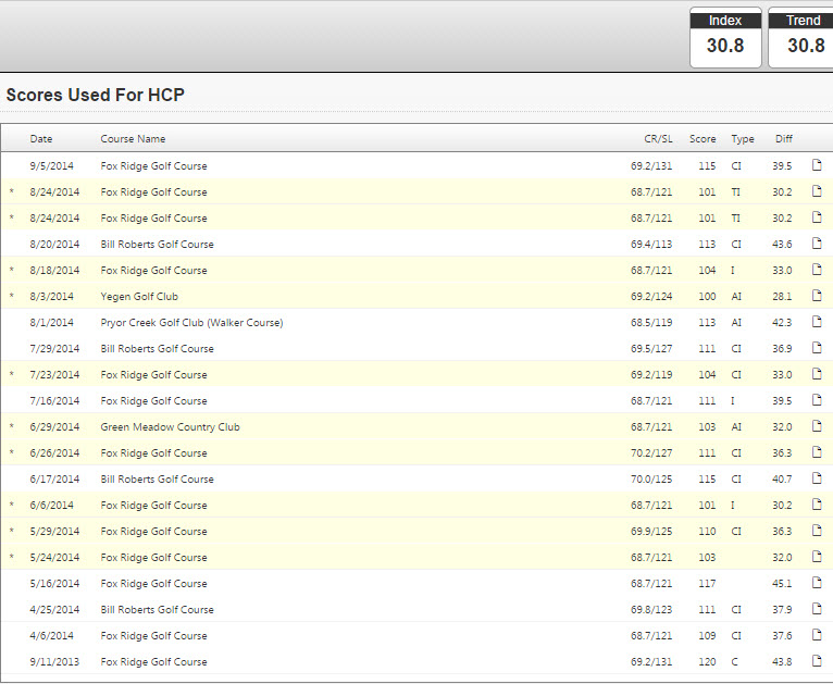 As I am getting ready to dust off my clubs for the year I was looking at last years scores...what a roller coaster ride.  I had a few near misses 1 100, 3 101s, 2 103s and 104.  Then several >= 110.  Hopefully this is the year I can push those scores just a little lower.  :)