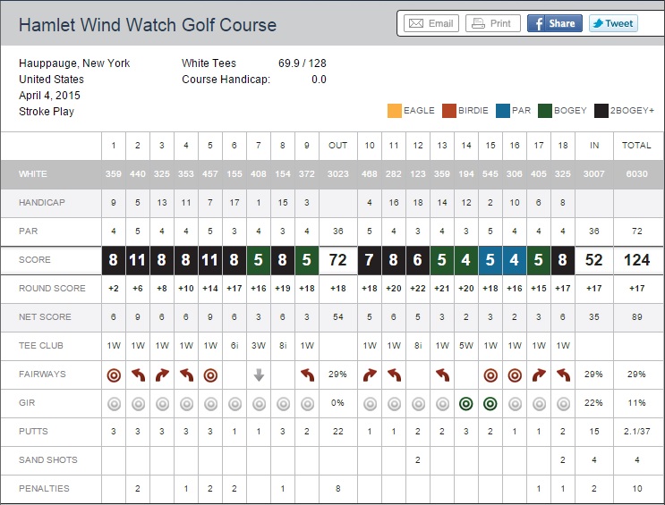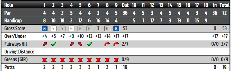 I did have two bright spots.  I drained an 18 footer for bogey on 7 after my I mishit my tee shot with my 3W (and it went 56 yards) and draining a 40 footer for bogey when I put my drive OB on 17.