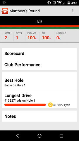 So because of my futzing around with the app and tags it recorded a 607 yard hole-in-one.  Not quite as amazing as my first recorded drive, however: