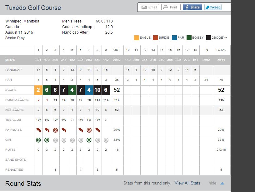 Thought I had a bad round.  Looked at my Game Golf score and was pleasantly surprised.  Then I went home and fixed it up: added a missed penalty and a shot.  So yeah, bad round.  Can't complain, though, I haven't been practicing at all and I really need to practice my short-game, especially putting.