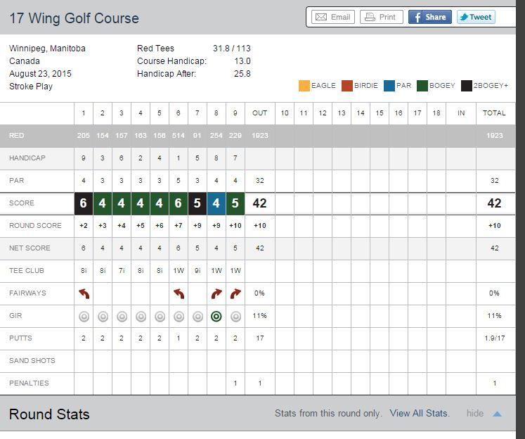 Set my personal best 9-round on my course of +10. Was playing in some extreme wind and after-rain conditions in Winnipeg that day. The course is pretty open to wind, and more holes were perpendicular to the wind than not. I actually think I had a +7/8 possible in better conditions, and if I decided to not use a 5i shot, a club I rarely pull out and shoot. (Duffed the shot and got like 25 yards out of it)