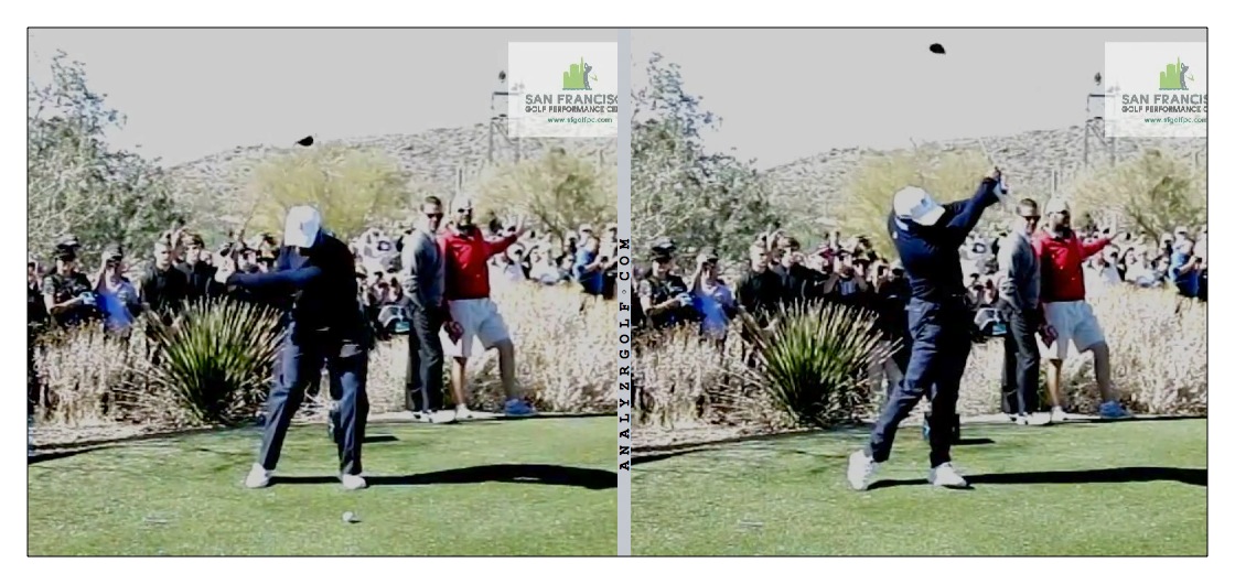 I do. It is pretty common for good players to lower the head a little on the downswing then have it move upward somewhat. All these players are thrusting, their weight gets forward, knees are flexed, they're in their forward bend in the left pics and then they come out of their forward bend, they extend the legs, tuck their butt, point their belt buckles to the sky. It's a ballistic movement.