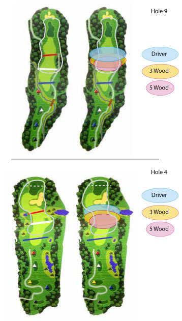 I worked on changing the way I traditionally play a couple of problematic holes on Sunday and shot a good round. Here are a couple of par 4's I made changes to. The shot zones are not very scientifically calculated but this is what I've come up with simply based on what I think. The white shape indicates a playable shot.