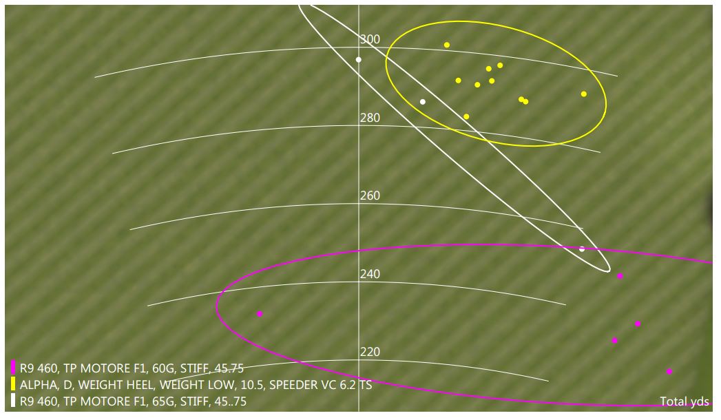 The driver that worked the best for me was the Callaway Big Bertha Alpha with an X-stiff Fujikura Speeder VC 6.2 Tour Spec shaft. Average clubhead speed was 110.2, average carry 275.2, average total 293.0. Spin rate 2573 rpm. Here is my dispersion (Big Bertha Alpha in yellow).