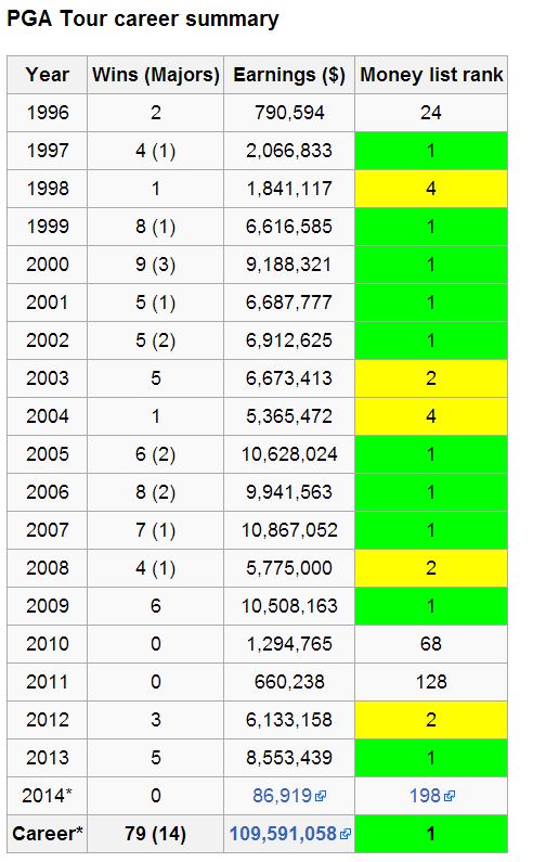 I wouldn't say he lost 3 years in his prime. 5 wins in 2003 is pretty good, that was his last year with Butch, and transitioning with Hank. He lost 2004. Then he had a great stretch there with Haney. Then in 2008 he had that knee injury at the US Open, and in 2009 he had that incident with his ex-wife. After Haney he's had injuries pop up. So, I would say the swing changes cost him much of anything. Looked like he was getting back into form in 2013, but then again he got injured. I wouldn't rip him on the swing changes, they didn't mess up his game to the point he wasn't dominant. It only cost him what, 1 year between Butch and Harmon. It's hard to say what cost him between Haney and Foley. The swing changes or his injuries.