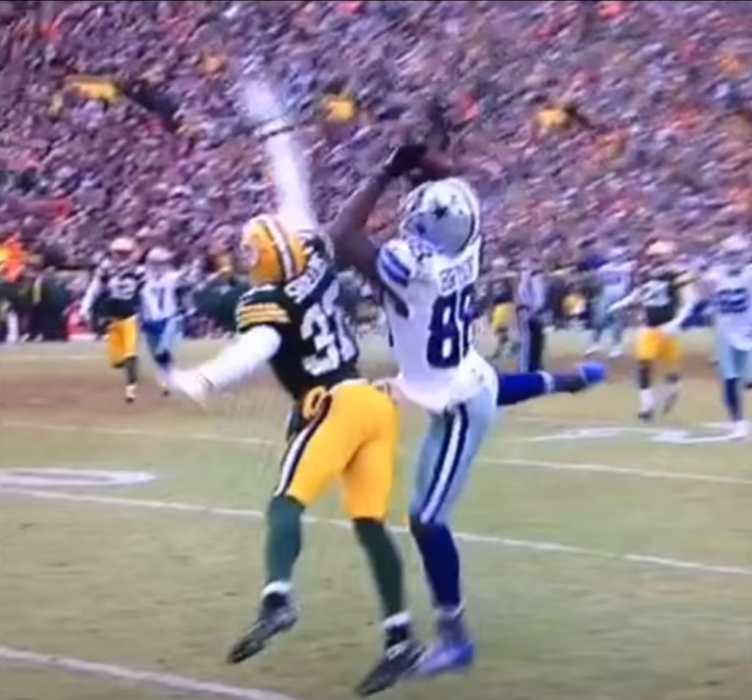 This screengrab (though blurry) shows the ball NOT in control by Dez. He gains control as he lands down, and the landing/stumbling/falling is all one move, which is simultaneously being made while securing the catch...not after securing it.
